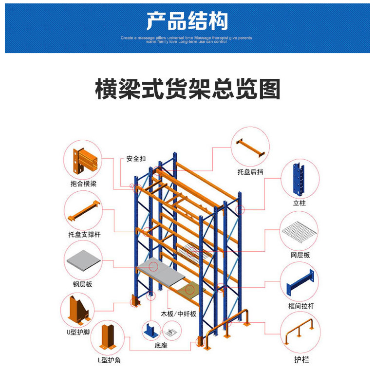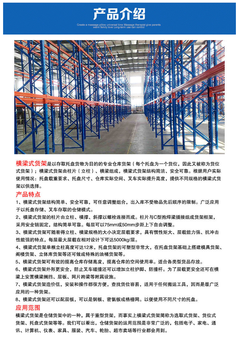 俗稱橫梁式貨架,或稱貨位式貨架,屬于托盤貨架類,在國內(nèi)的各種倉儲(chǔ)貨架系統(tǒng)中為常見一種貨架形式。以立柱片+橫梁形式的全組裝結(jié)構(gòu),結(jié)構(gòu)簡明有效。可根據(jù)存儲(chǔ)單元集裝設(shè)備的特性加裝如:隔檔、鋼層板(木層板)、金屬絲網(wǎng)層、倉儲(chǔ)籠導(dǎo)軌、油桶架等功能性附件。滿足不同單元集裝設(shè)備形式的貨物存儲(chǔ)。 |